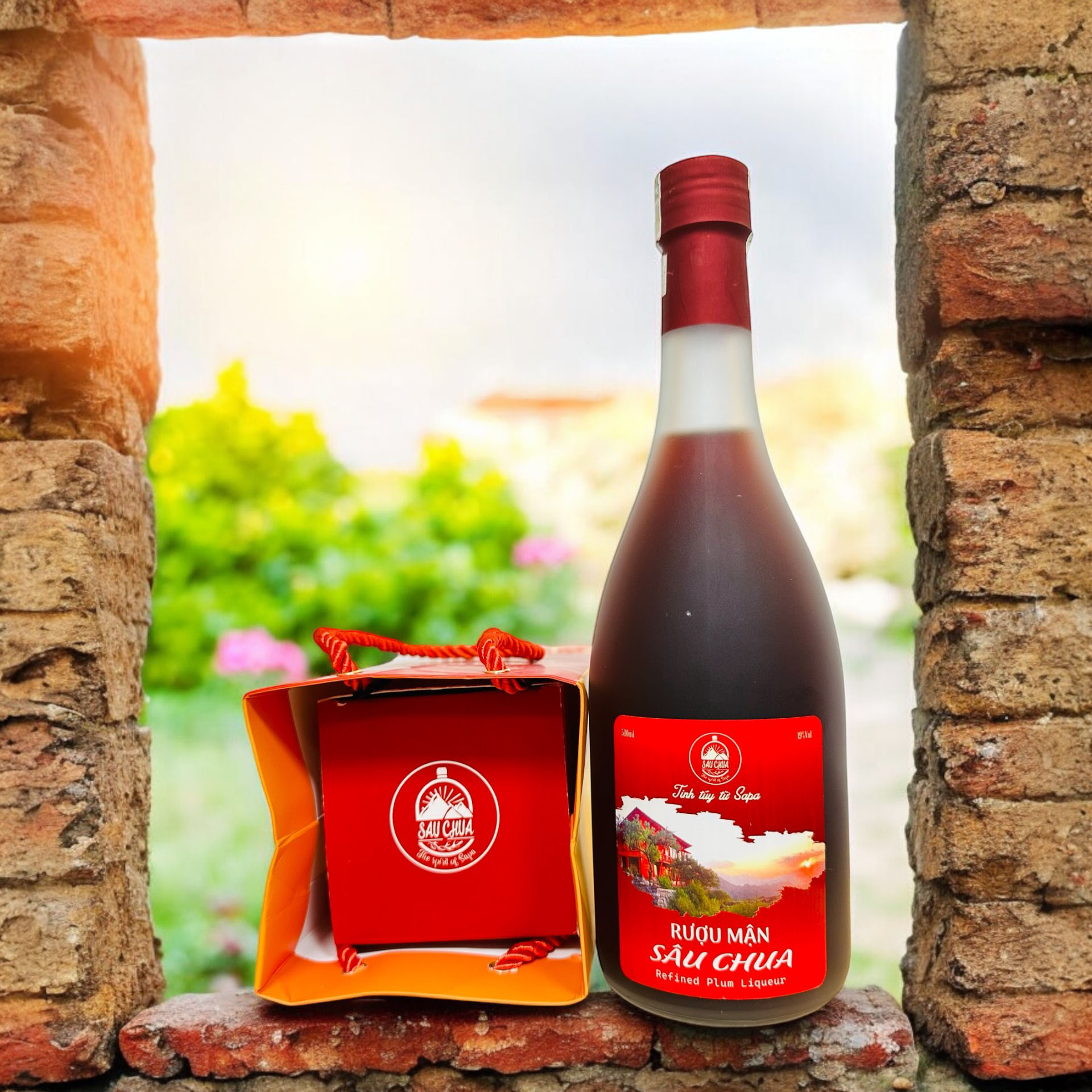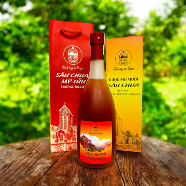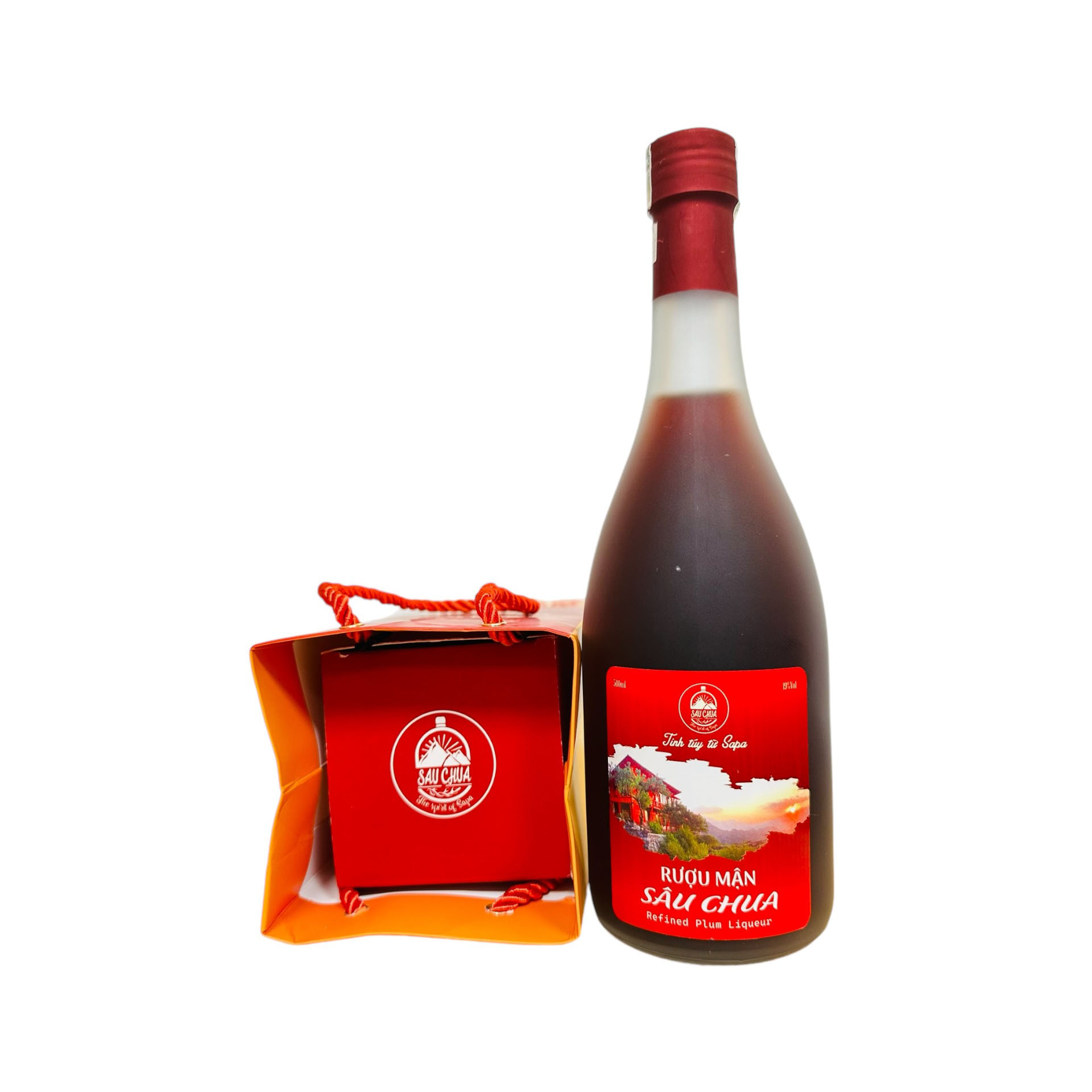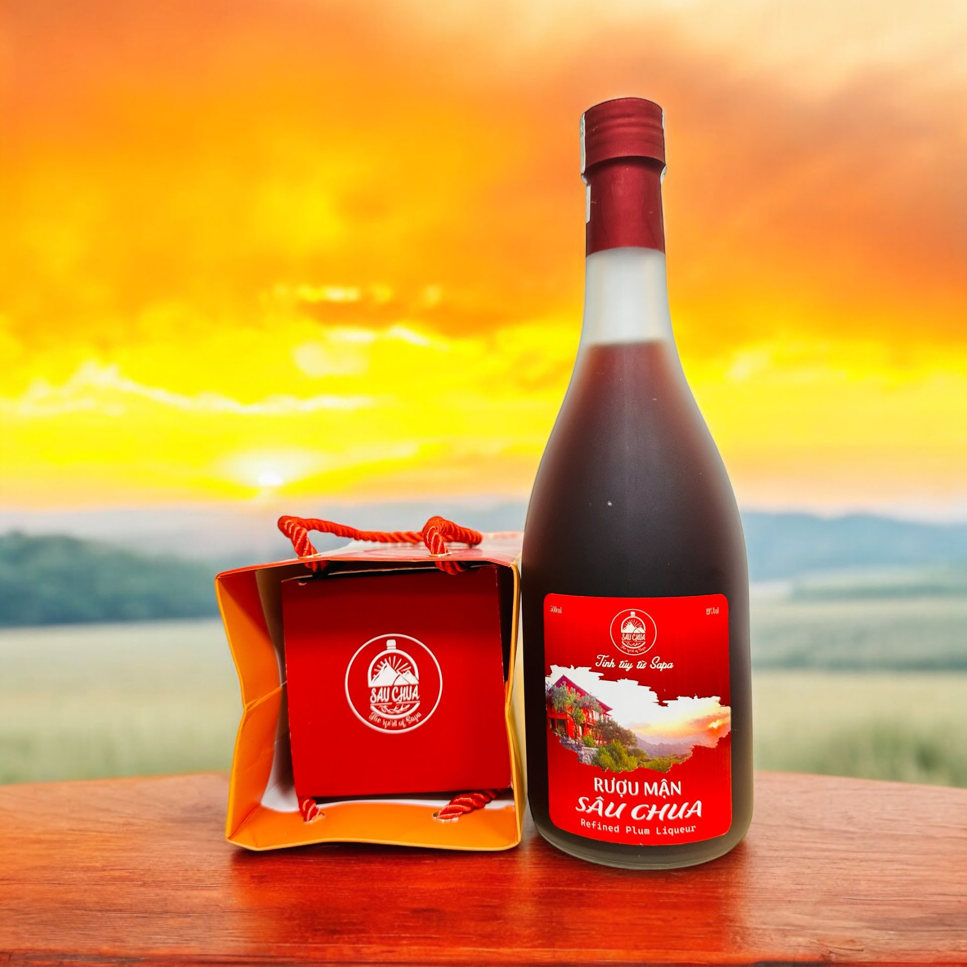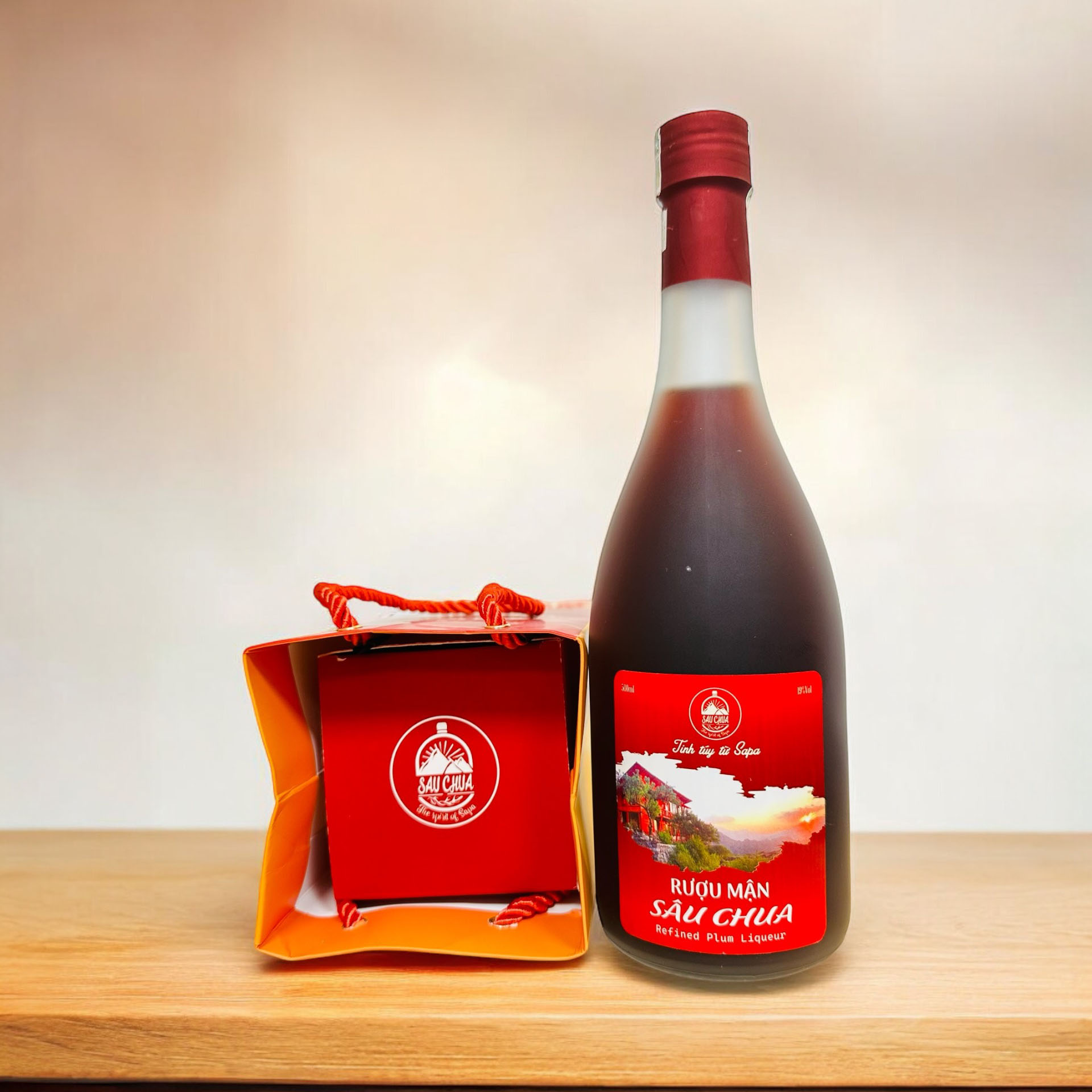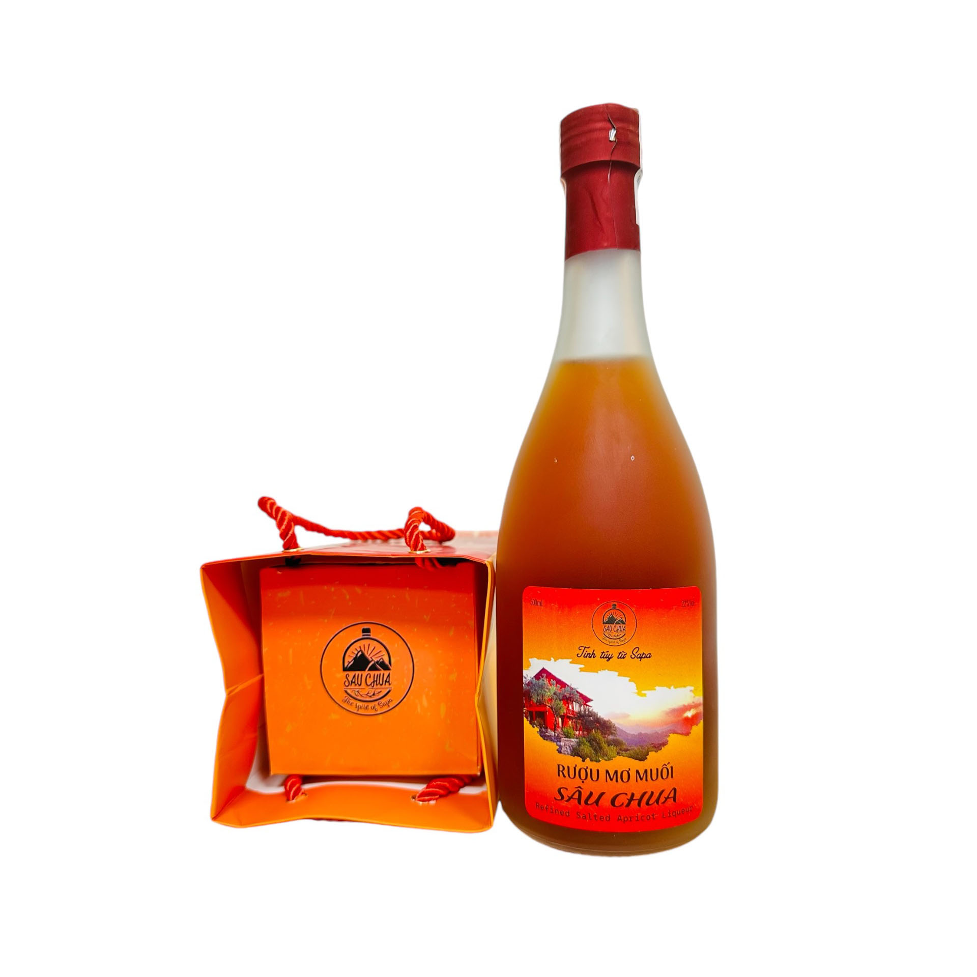 Set quà Sâu Chua Set 1, gồm 01 chai rượu mơ/mơ muối/mận Sâu Chua 500ml, kèm hộp giấy và túi xách.