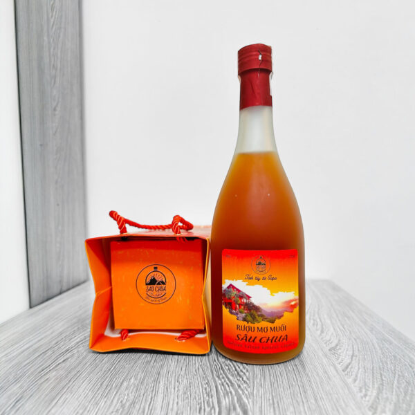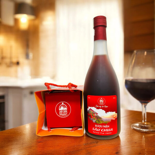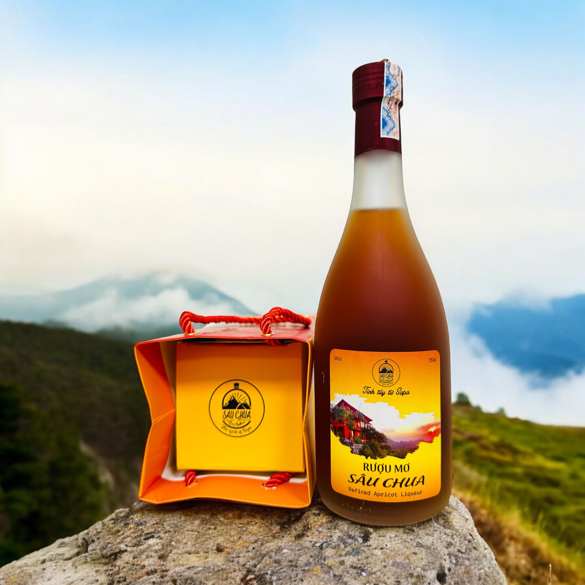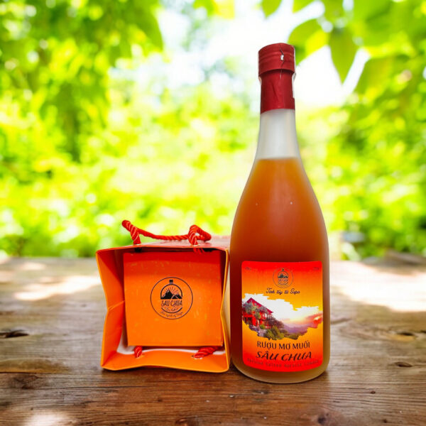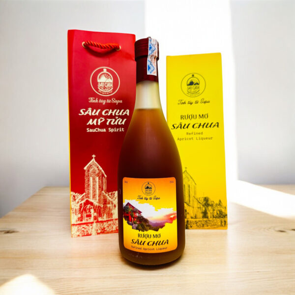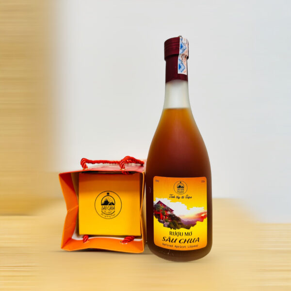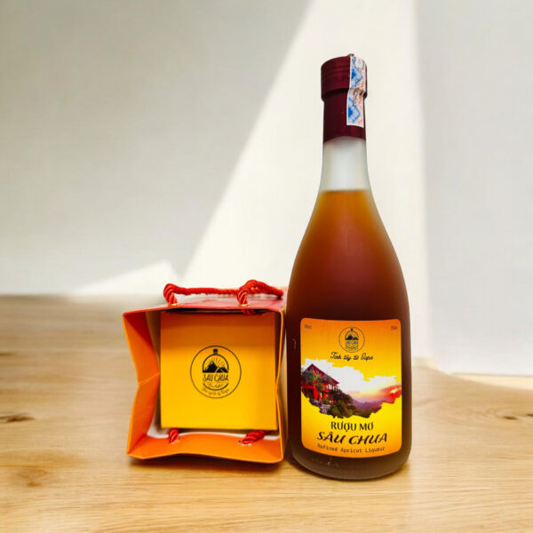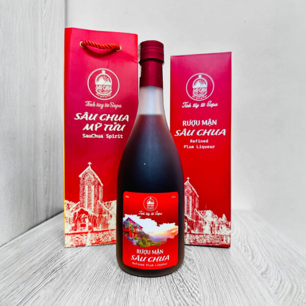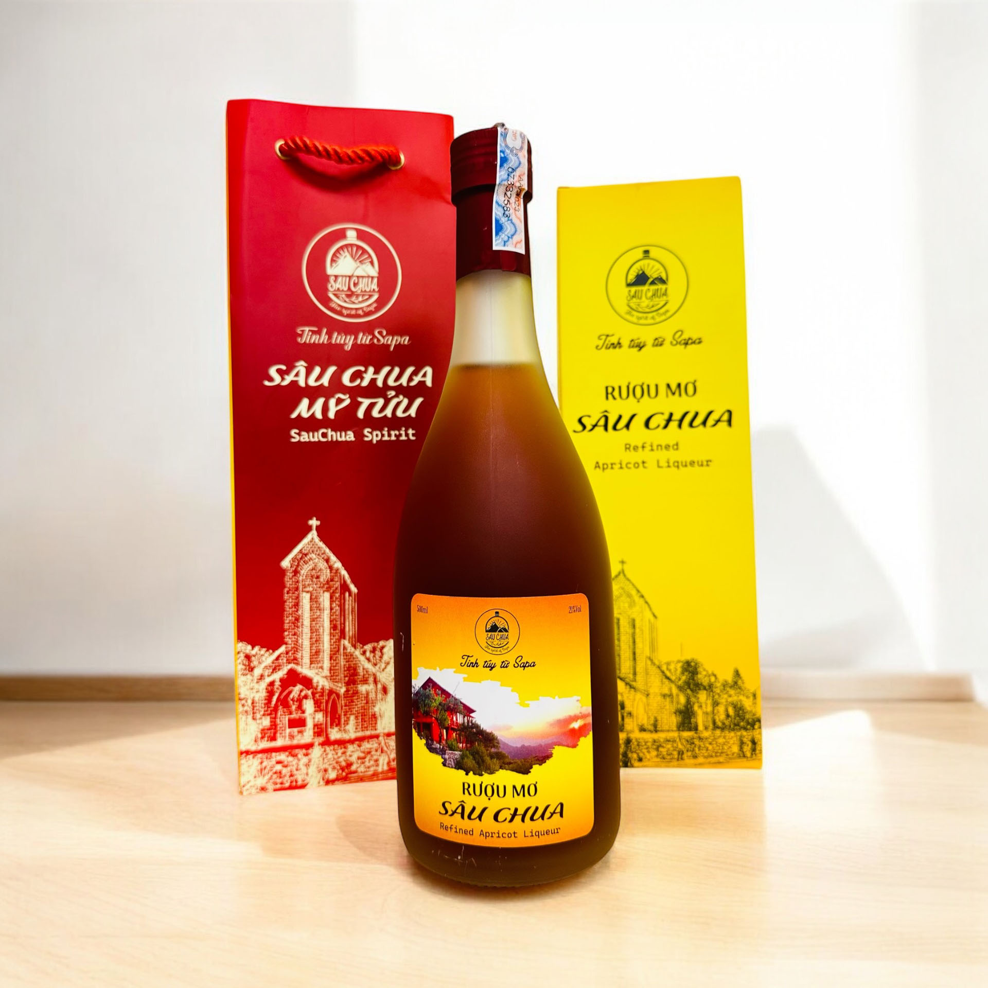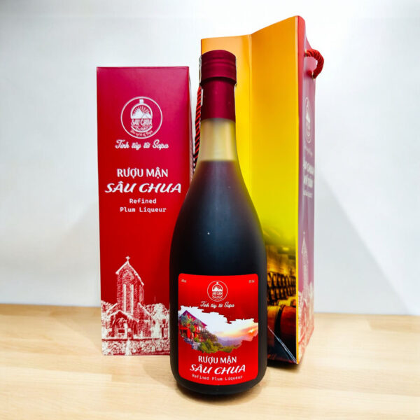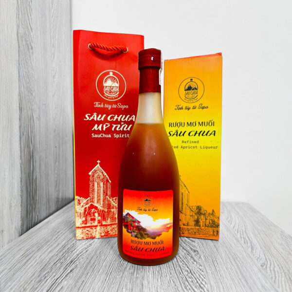 Set quà Sâu Chua Set 1, gồm 01 chai rượu mơ/mơ muối/mận Sâu Chua 500ml, kèm hộp giấy và túi xách.