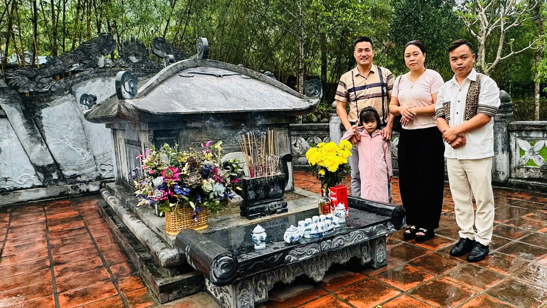 Chỉ vài phút sau, chú quay lại, mang theo thêm mấy chiếc ô. Không chỉ đưa ô, chú còn tận tình dẫn đường, chỉ lối lên khu mộ, chuẩn bị hương và cẩn thận châm lửa, chia cho từng người trong đoàn. Giữa cơn mưa, dưới những tán cây tĩnh lặng, mọi thứ diễn ra chậm rãi và trang nghiêm.