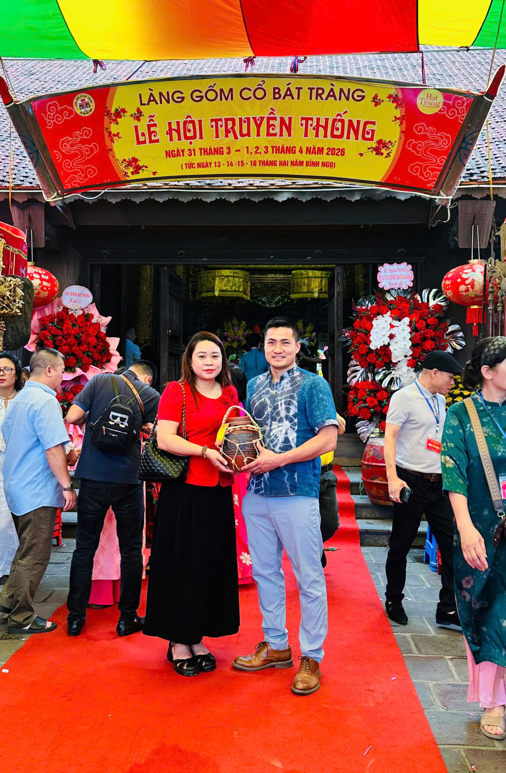 Ảnh: Anh chị Thuận – Thu, co-founder của Sâu Chua Mỹ Tửu dâng chum Mỹ tửu tại Đình thờ Tổ nghề Bát Tràng