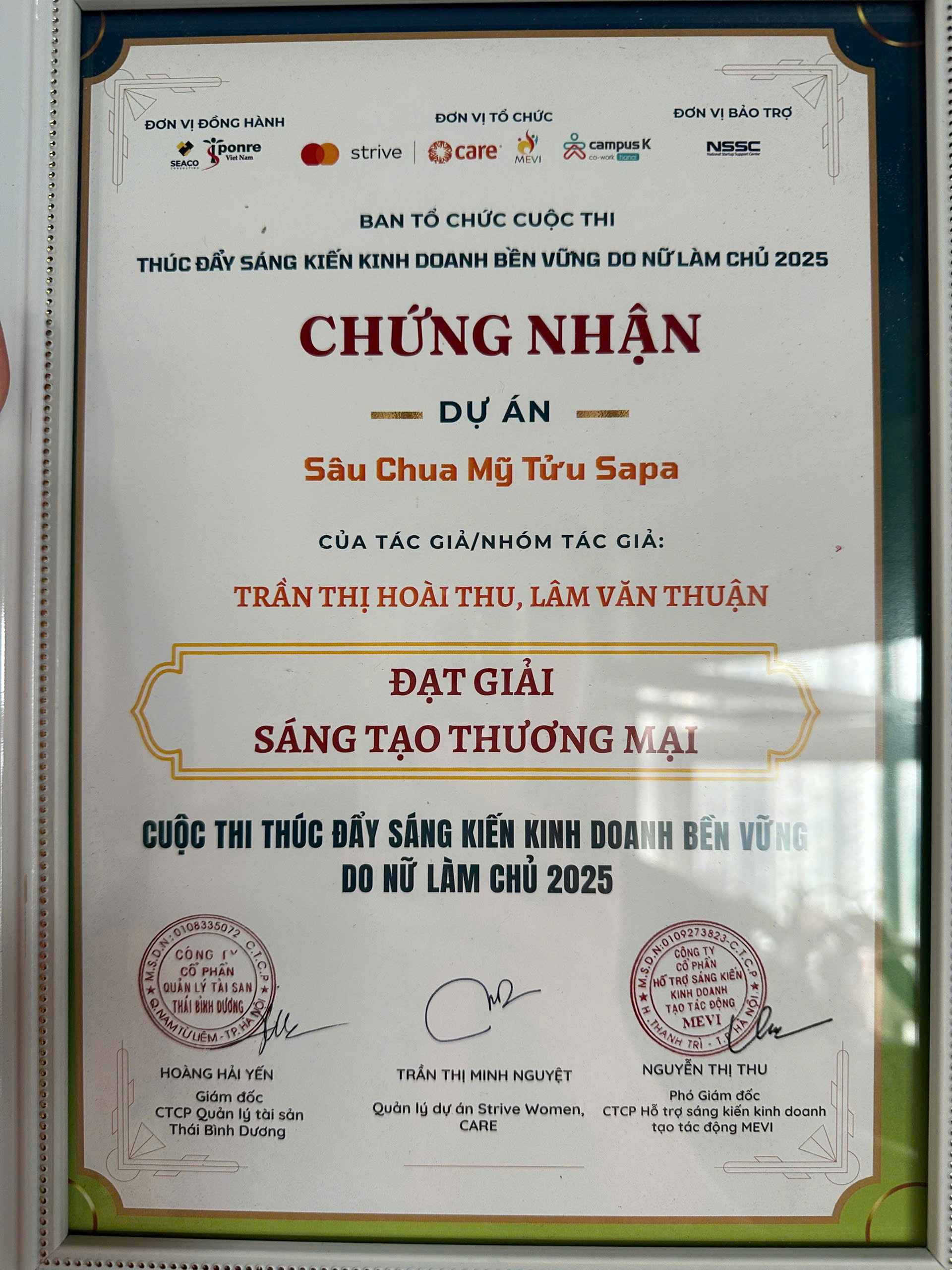 Ngày 21/9/2025, tại cuộc thi “Thúc đẩy sáng kiến kinh doanh do nữ làm chủ”, do CARE International Việt Nam phối hợp cùng Mevi và các đối tác tổ chức, Sâu Chua Mỹ Tửu đã vinh dự được Ban giám khảo đánh giá cao về những sáng tạo trong quá trình xây dựng và phát triển thương hiệu, và xuất sắc nhận giải thưởng “Sáng tạo thương mại”.